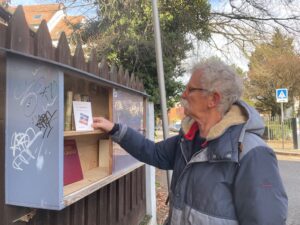 Joël Henry, le créateur du Laphotex, dépose son livre dans une boîte à Strasbourg.